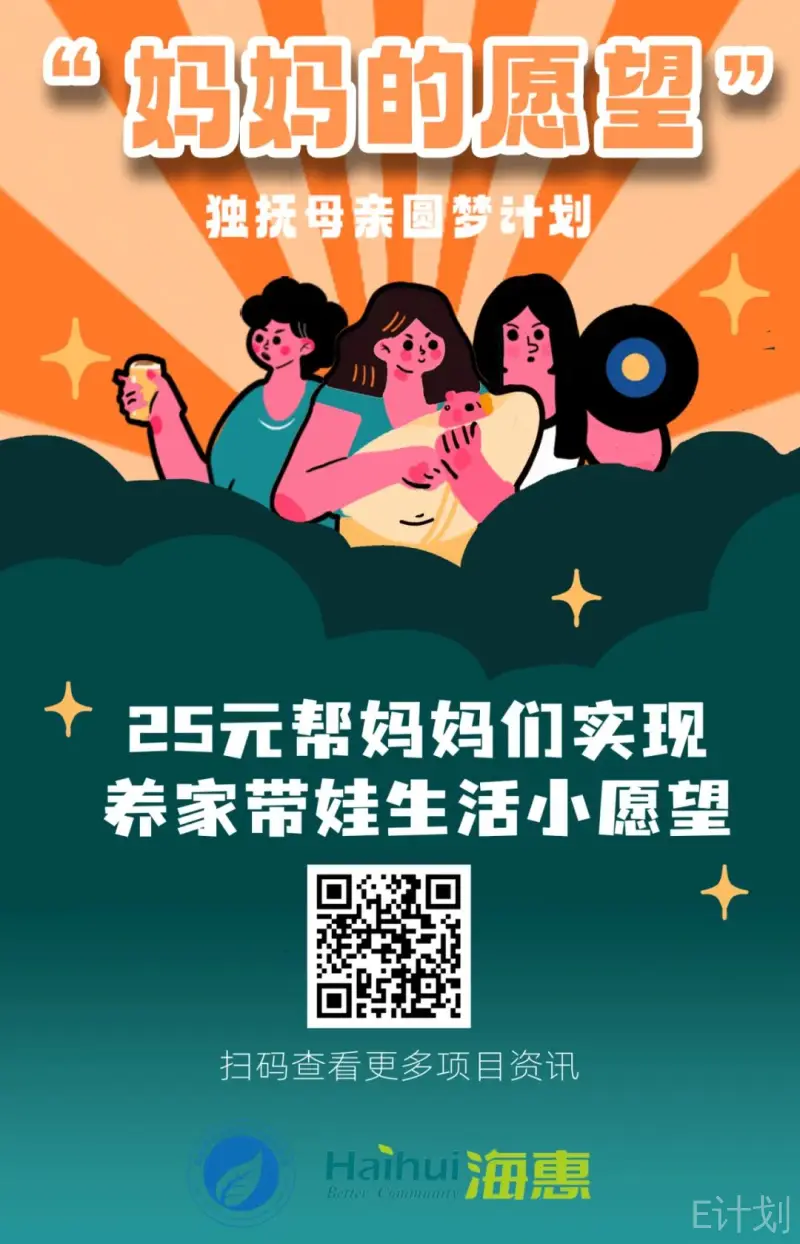 “妈妈的愿望”独抚母亲圆梦计划是由海惠发起、成都市慈善总会和成都市社会组织乡村振兴联盟支持的公益项目,计划为四川省遂宁市大英县内,年龄在25-45岁之间,家庭月收入1000元以下的40名独抚妈妈提供愿望金协助其完成在抚育、家庭生活物资、妈妈个人成长&疗愈板块的心愿,为其搭建在地和线上的妈妈互助社群和相关社会支持系统。
