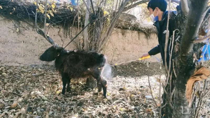 图 | 白格村防疫员对小牦牛身上的蜱虫进行消杀(消杀蜱虫时,需要将牛套住,并预防牛用舌头舔身体的消杀液)