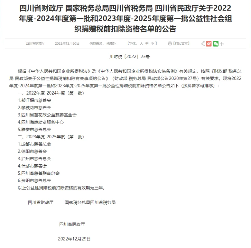 2023年的首个工作日,海惠便迎来了首个特大喜讯,获由四川省财政厅、国家税务局四川省税务局、四川省民政厅联合发布的2022年度-2024年度第一批公益性社会组织捐赠税前扣除资格!