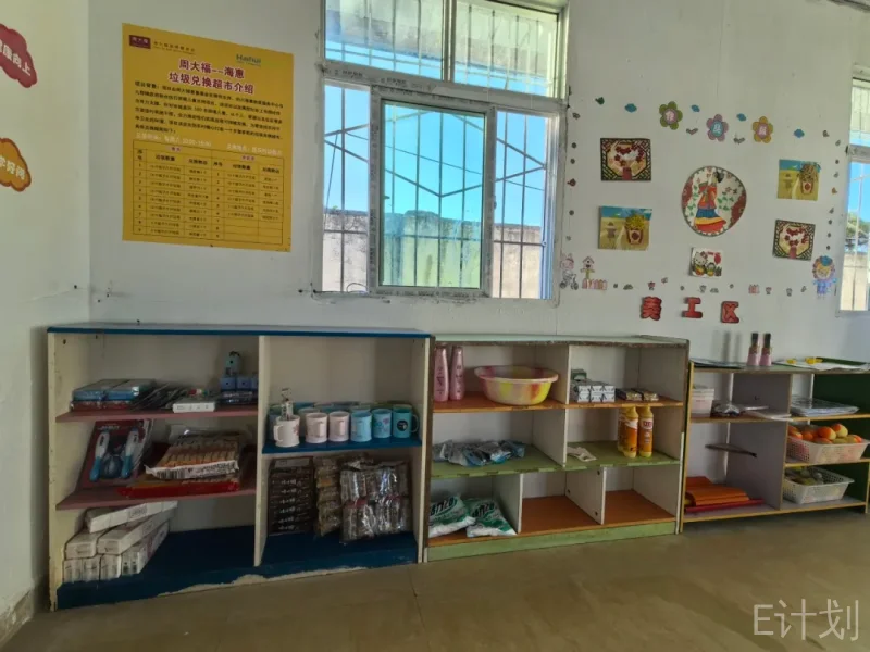 孩子们可以用易拉罐、塑料瓶、废旧电池、废弃纸箱等垃圾兑换文具或小礼品。收集的垃圾会统一进行回收处理。