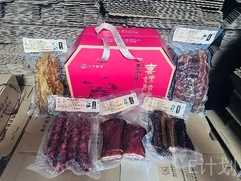 湖南喜妹腊制品加工有限公司推出的腊味礼盒,包含五花腊肉500克、腊排骨500克、腊大肠300克、后腿腊肉500克、腊香肠500克。