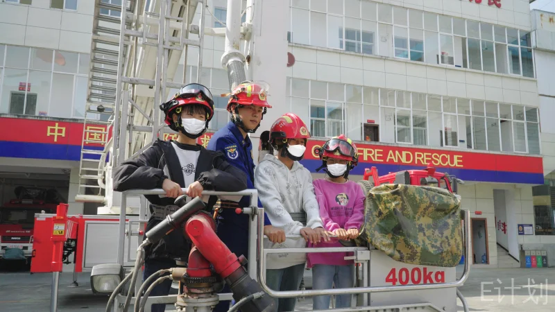 为了让孩子们在探索世界的同时学会自我保护,活动中特别安排了消防大队体验环节。在那里,孩子们穿上沉甸甸的消防服,登上消防车,亲手操作灭火器,并在互动问答中加深了对消防知识的理解。
