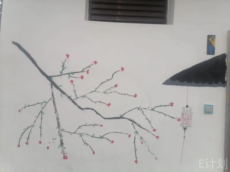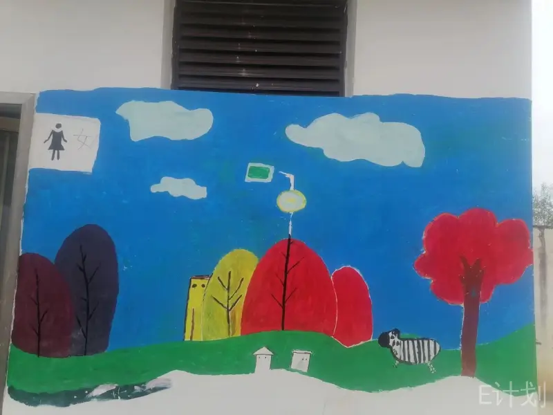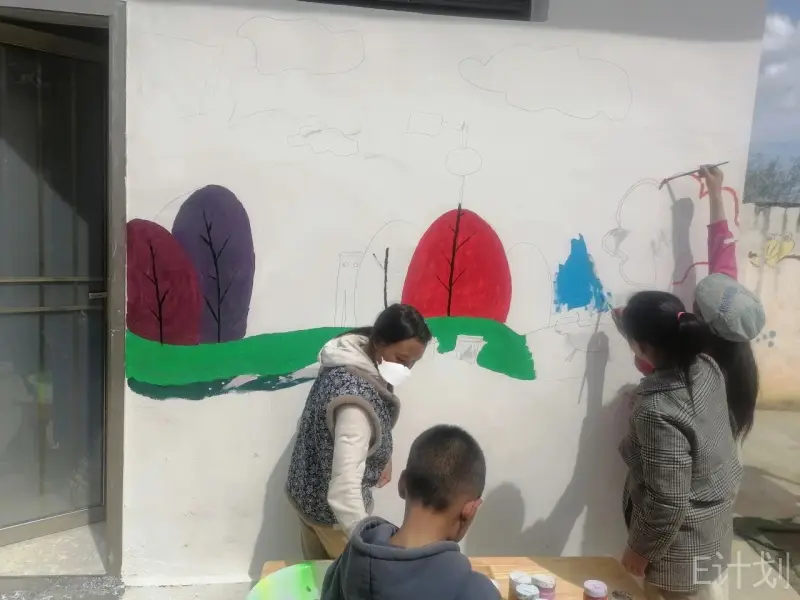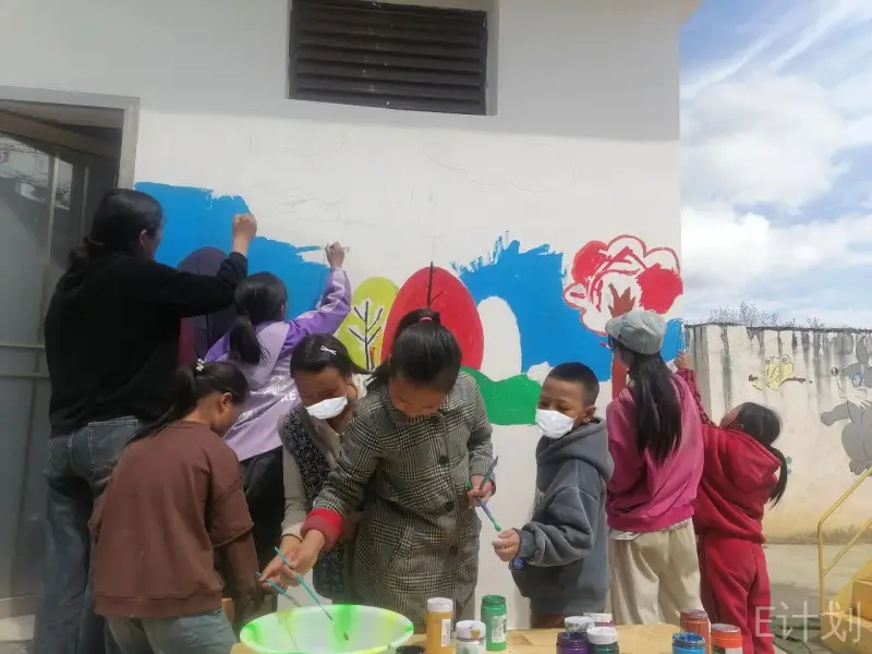 飞峨村,志愿者带领孩子们一起拿起画笔,在公共浴室的外墙上留下了大家共同完成的画作。
