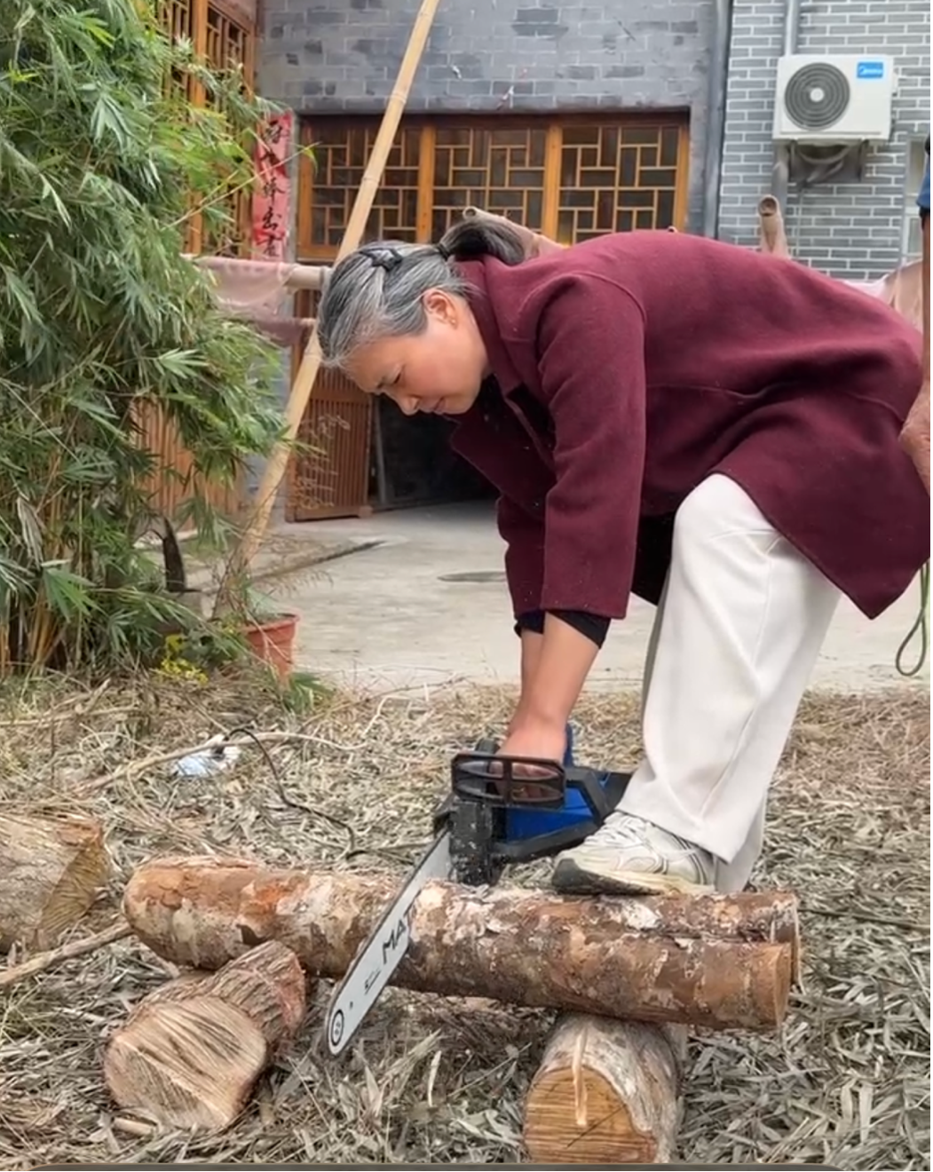 她边锯边笑道:“我们女的没有他们男人的体力,要想上山砍个竹子砍个木头什么的,就得有工具。这锯花了我 600 多块。”
