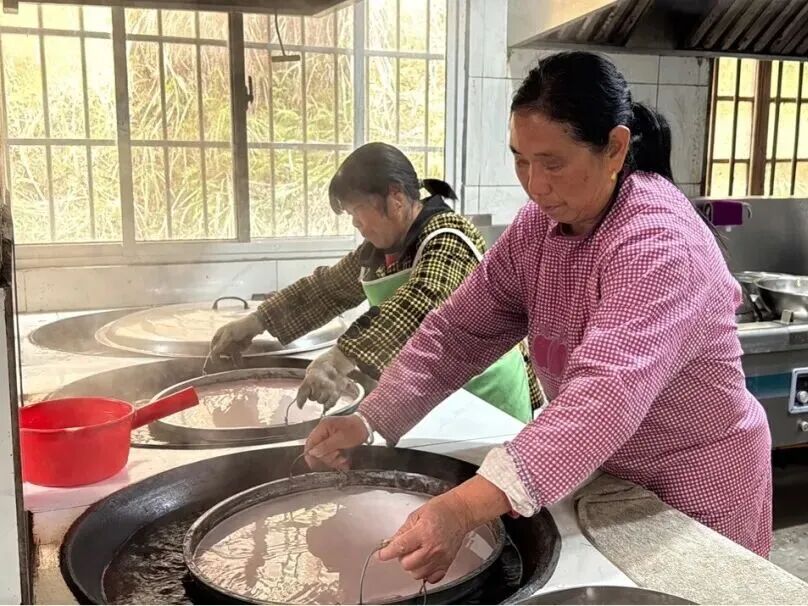 潘银凤领着妇女们有说有笑地干活。她们先将紫薯粉加水搅成糊状,将一大勺紫薯糊倒进一个类似平底锅的铁盘内,令其均匀摊开在铁盘上。再把铁盘平放于大锅内的沸水上,盖上锅盖。一两分钟之内,紫薯糊受热凝固成一片湿乎乎的紫薯粉皮。再把它搭在粗粗长长的竹竿上,待竹竿上挂满了,两人便将竹竿抬到门外晾晒。