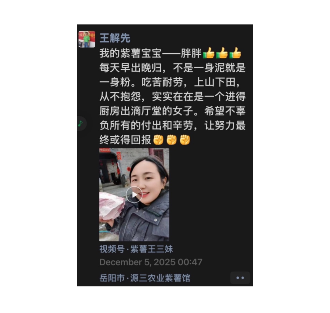 我采访完不久,王解先上任稻竹村村支书。1 月 9 日,她发了这样一条朋友圈:
