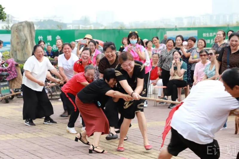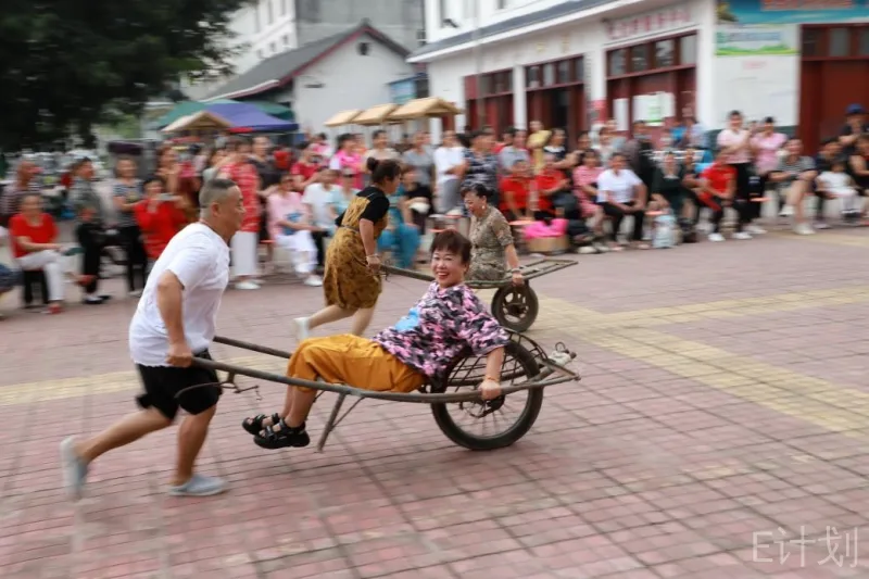 舞蹈表演后是两个精彩的互动游戏。率先举行的拔河比赛吸引了数十人参与,城乡居民混搭组队,在鼓声中、加油声中、笑声中你来我往3个回合方分出胜负。另一个鸡公车运人接力赛则更具趣味性。鸡公车本是农村短途运输粮食、农资等的工具,在游戏中却用来做运人比赛的道具。城里的居民战战兢兢坐上车,农村的居民笑得乐呵呵。你坐我推,我坐他推,输了的不服气就再来一回。输赢变得不那么重要,更重要的信任与友情在共同参与中潜滋暗长。