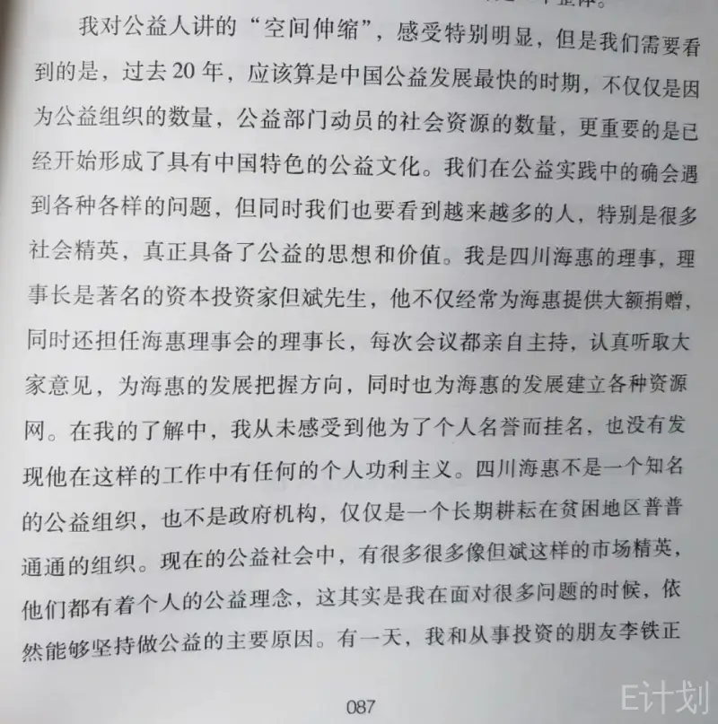 另外,但总的公益理念和实践也得到了诸多资深公益人、学者的认可与感谢。中国农业大学文科资深讲席教授、被誉为“中国发展学之父”、曾担任中国农业大学人文与发展学院院长、公共管理学院院长等职位的李小云教授的新书《公益的元问题》,便有这样一段对于但总的描述: